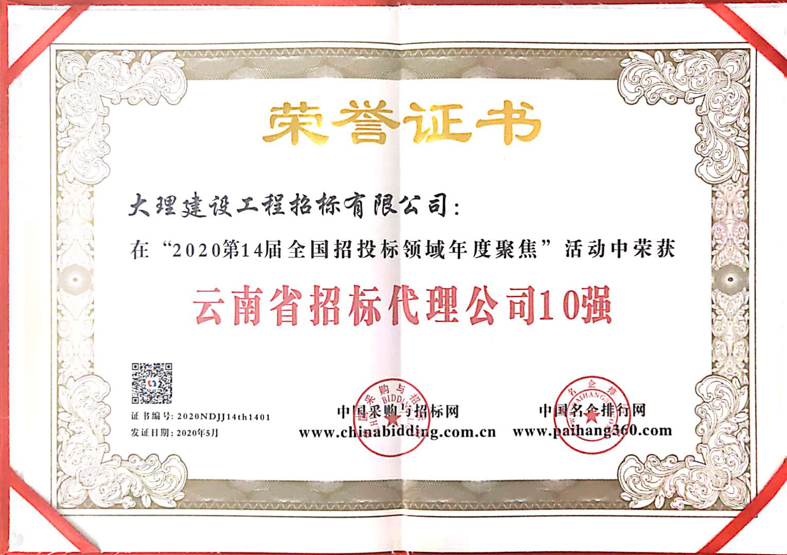 大理建設(shè)工程招標(biāo)有限公司榮獲云南省招標(biāo)代理公司10強(qiáng)