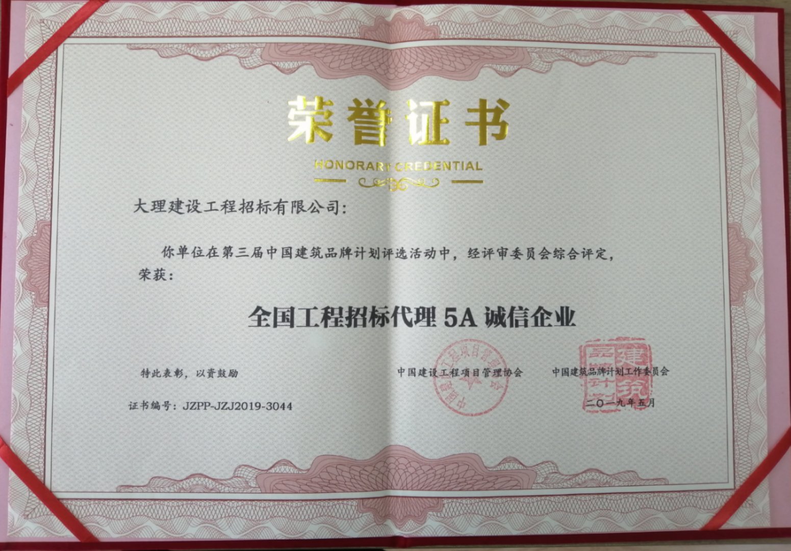 大理建設(shè)工程招標有限公司在第三屆中國建筑品牌計劃評選活動中,榮獲:“全國工程招標代理5A誠信企業(yè)”